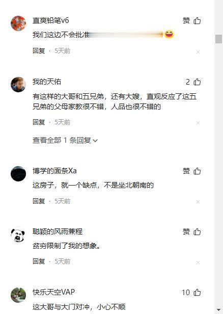有网友说,挺好!老话讲,这位当大哥的有样念及兄弟情谊,手足之情,事业发达后慷慨大方帮助四个弟弟解决住房问题,模范践行了中华优秀传统文化中伦理道德规范,令人钦佩,为构建和谐家庭和谐社会树立了标杆榜样!